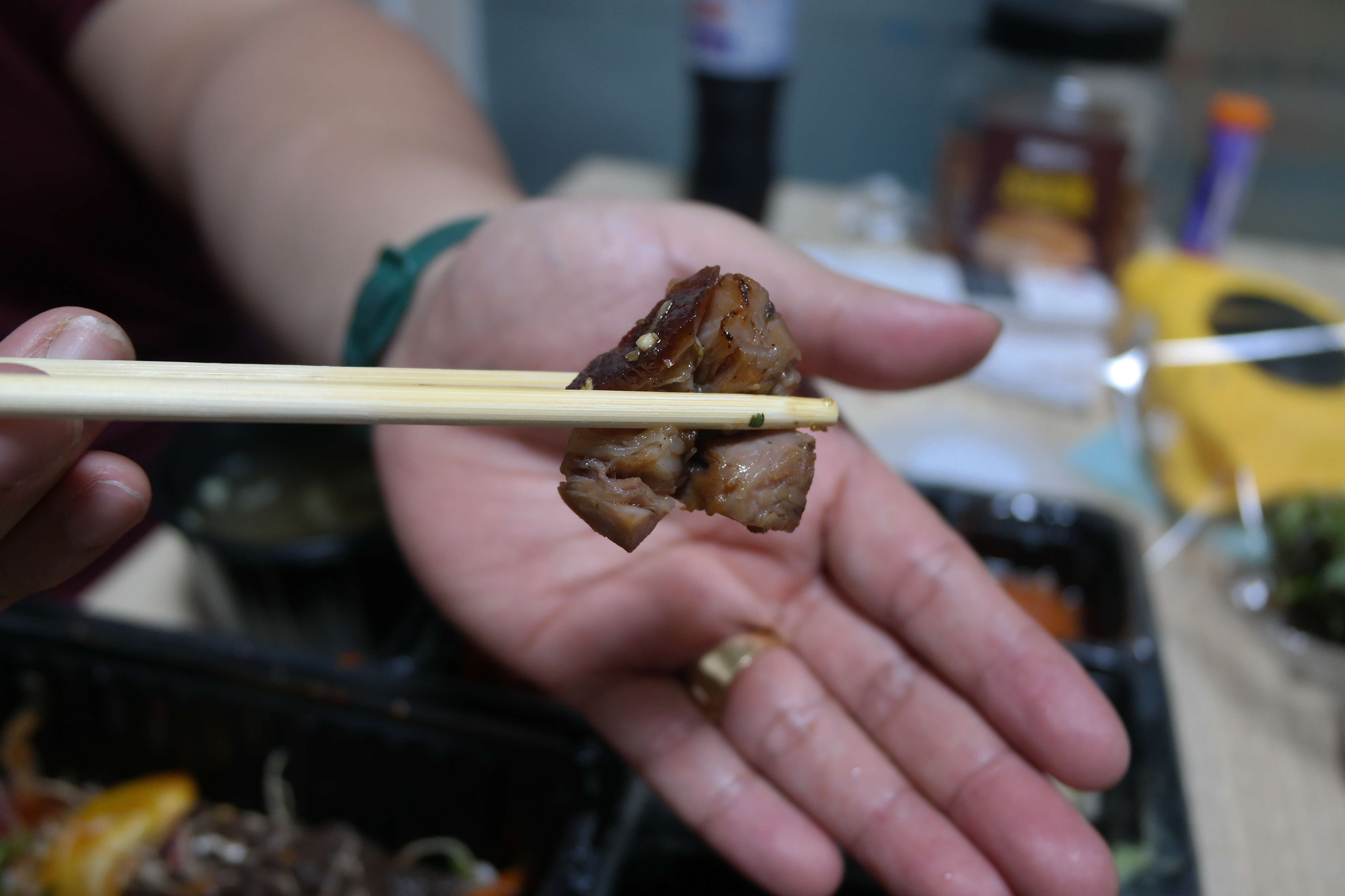 시꺼먼게 데리야끼 같은데 맛보면 매콤하다 매운소스인가봄~!